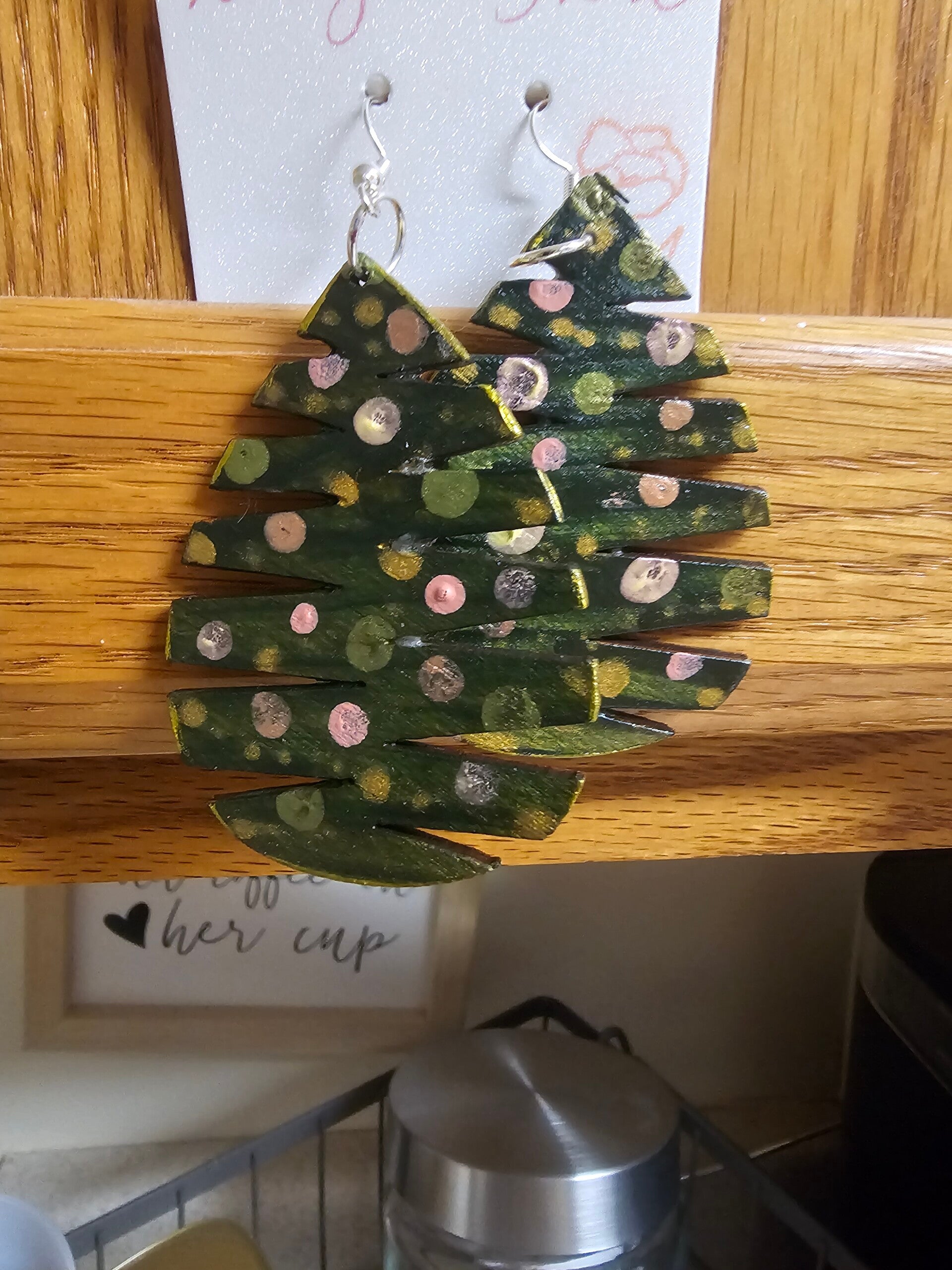 A handpainted evergreen tree on a wooden design featuring beautiful shimmered "lights"