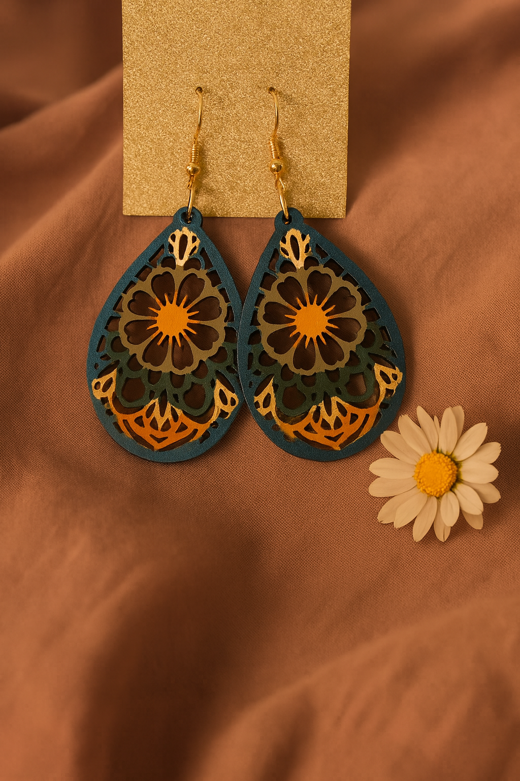 A sweet 1.5 inch tear drop shaped earring intricately designed & decorated in beautiful shimmery turquoise, beige & orange.